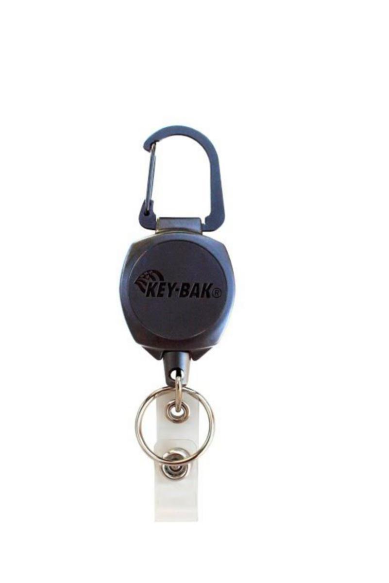 Robust holder med karabinhage og 60 cm Kevlar-snor for nem fjernelse og automatisk tilbagetrækning. Perfekt til nøgler og adgangskort på arbejde eller i hverdagen.